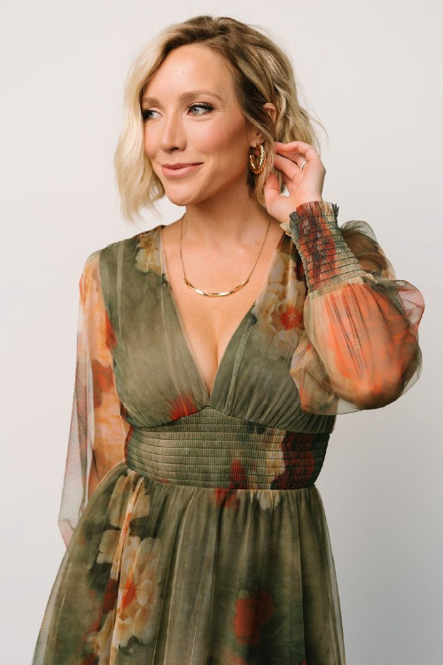 Want something that moves beautifully when you’re walking down the aisle as a guest? This tulle creates the most gorgeous flow, and those long sleeves mean no jacket needed. The delicate floral print looks amazing against fall foliage, trust me on this one.